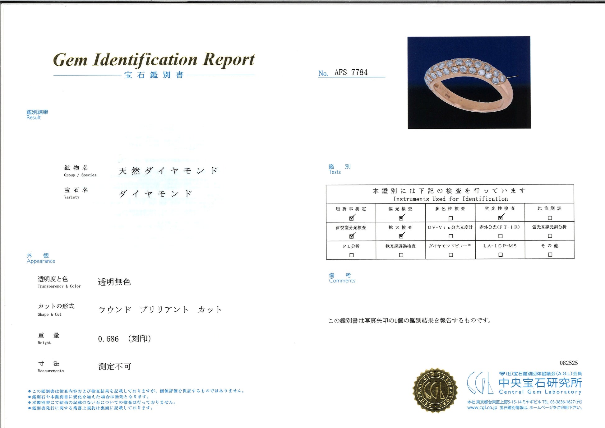 * **石:** 天然ダイヤモンド 0.686ct (刻印あり、鑑別書記載)
