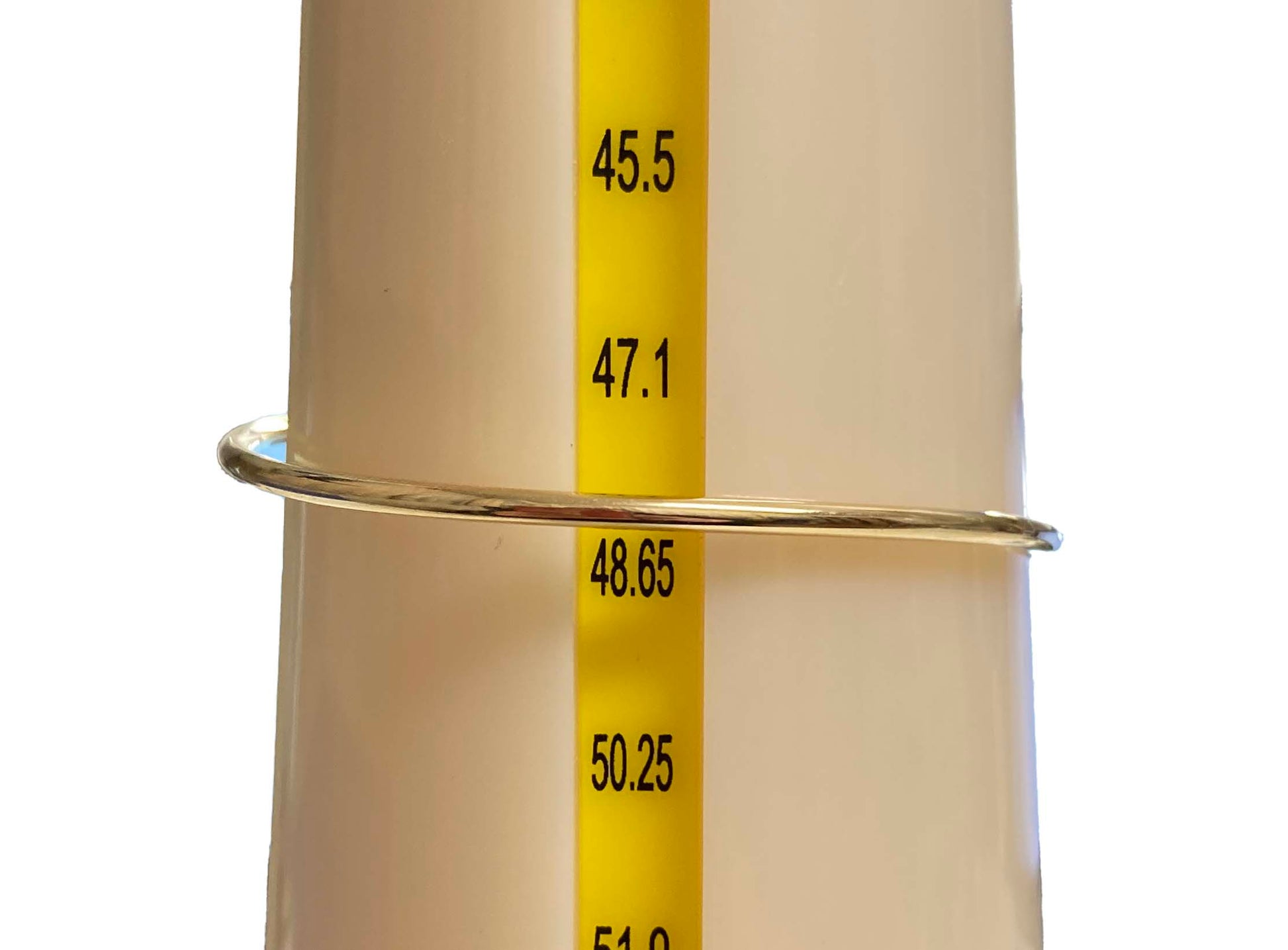 お手持ちのバングル等と比較されるか、ご自身の手首の最も幅の広い部分が5.5cm(55mm)を下回るかをご確認いただくことをお勧めします。